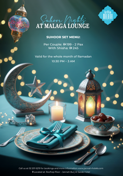 احتفلوا بهدوء ليالي رمضان مع تجربة سحور أنيقة في مالاغا لاونج، حيث تُقدم قائمة سحور محددة، مع إمكانية الاستمتاع بالأرجيلة لمن يرغب.